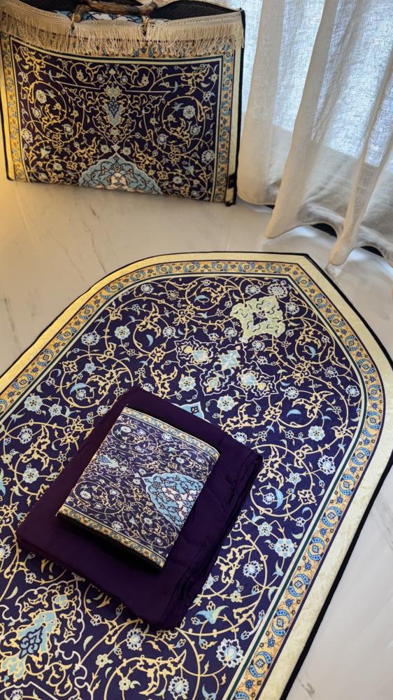 لو تبي طقم صلاه كامل يفتح النفس ويكون رايق من أول نظرة، الطقم البنفسجي بنقوشه الإسلامية بيخطفك بجماله. ناعم، أنيق، وكل قطعة فيه مختارة بذوق، من السجادة للجلال للشنطة وحتى غلاف المصحف.